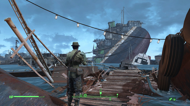 港の入り口で今回同行するコーサーの人と合流し作戦開始。港から見たときは漁船を改造した小さな拠点だと思ったんだが、どうやら奥の巨大な船の残骸まで含めた大規模な海上拠点のようだった。ヌカランチャー撃ってくるやつがいたので早めにガウスライフルクリティカル狙撃で始末した。